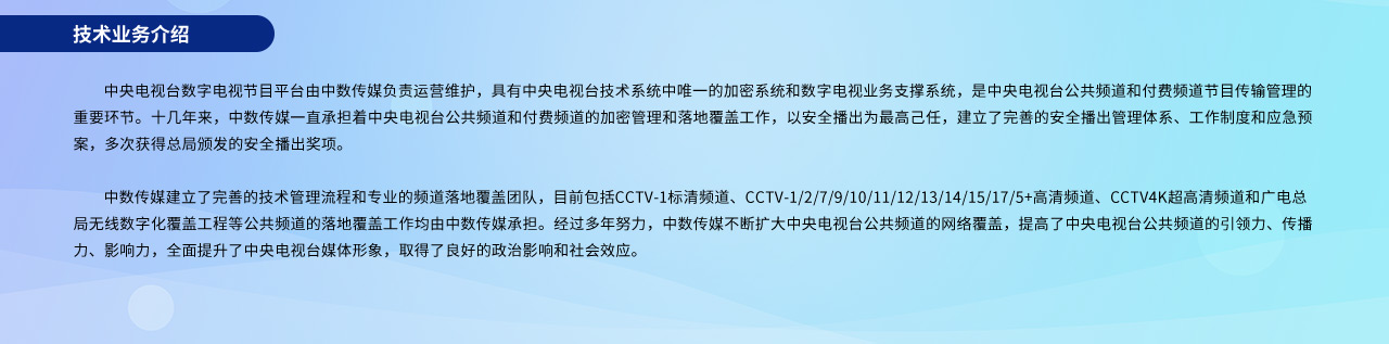 2018年10月開始,中數(shù)傳媒負責中國首個上星超高清電視頻道—中央廣播電視總臺4K超高清頻道的傳輸和落地宣傳工作,基本實現(xiàn)了中央廣播電視總臺4K超高清頻道的全國覆蓋。